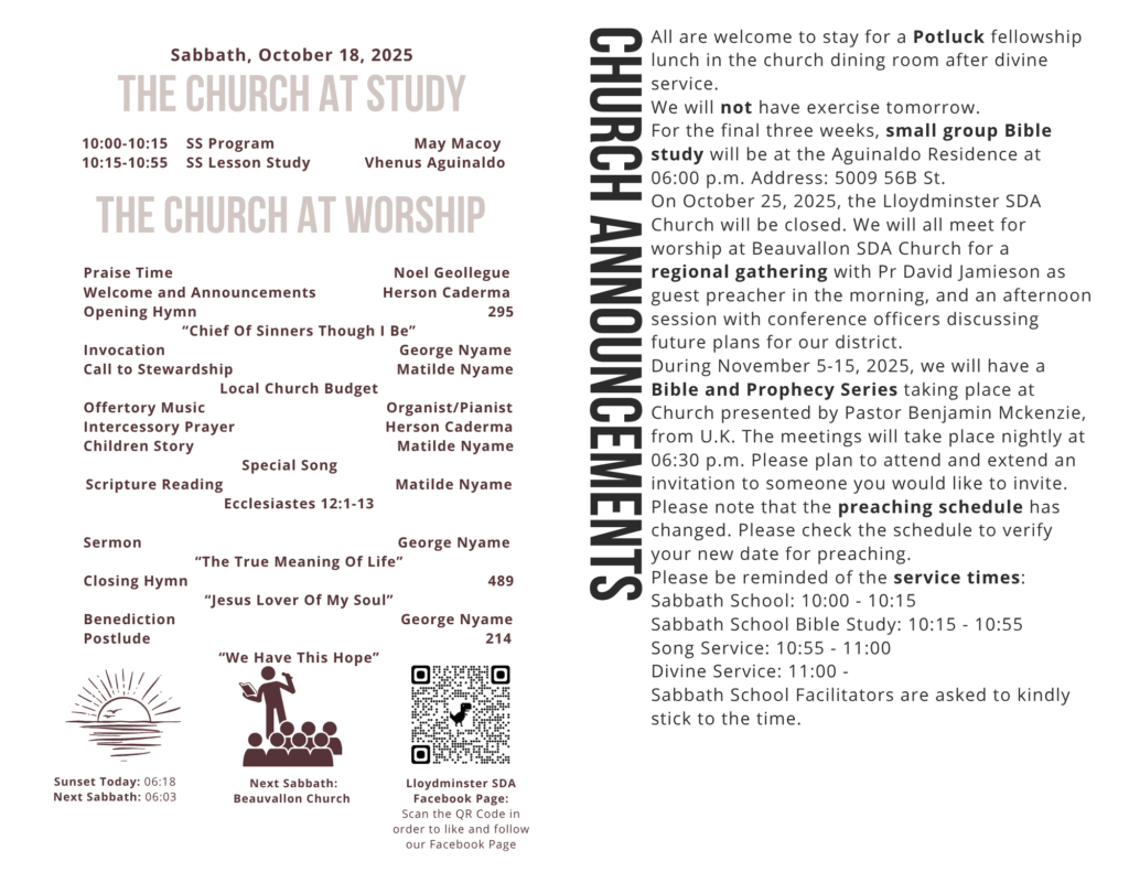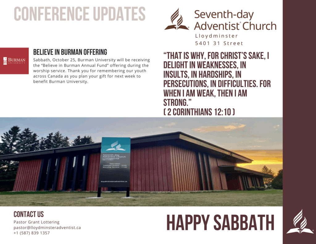 Welcome to the Lloydminster Seventh-day Adventist Church in Lloydminster, AB. We are a Christian community and would love to have you join our family. To learn more about what we believe you can visit our About Us page. Please join us for Bible study, worship, and prayer.